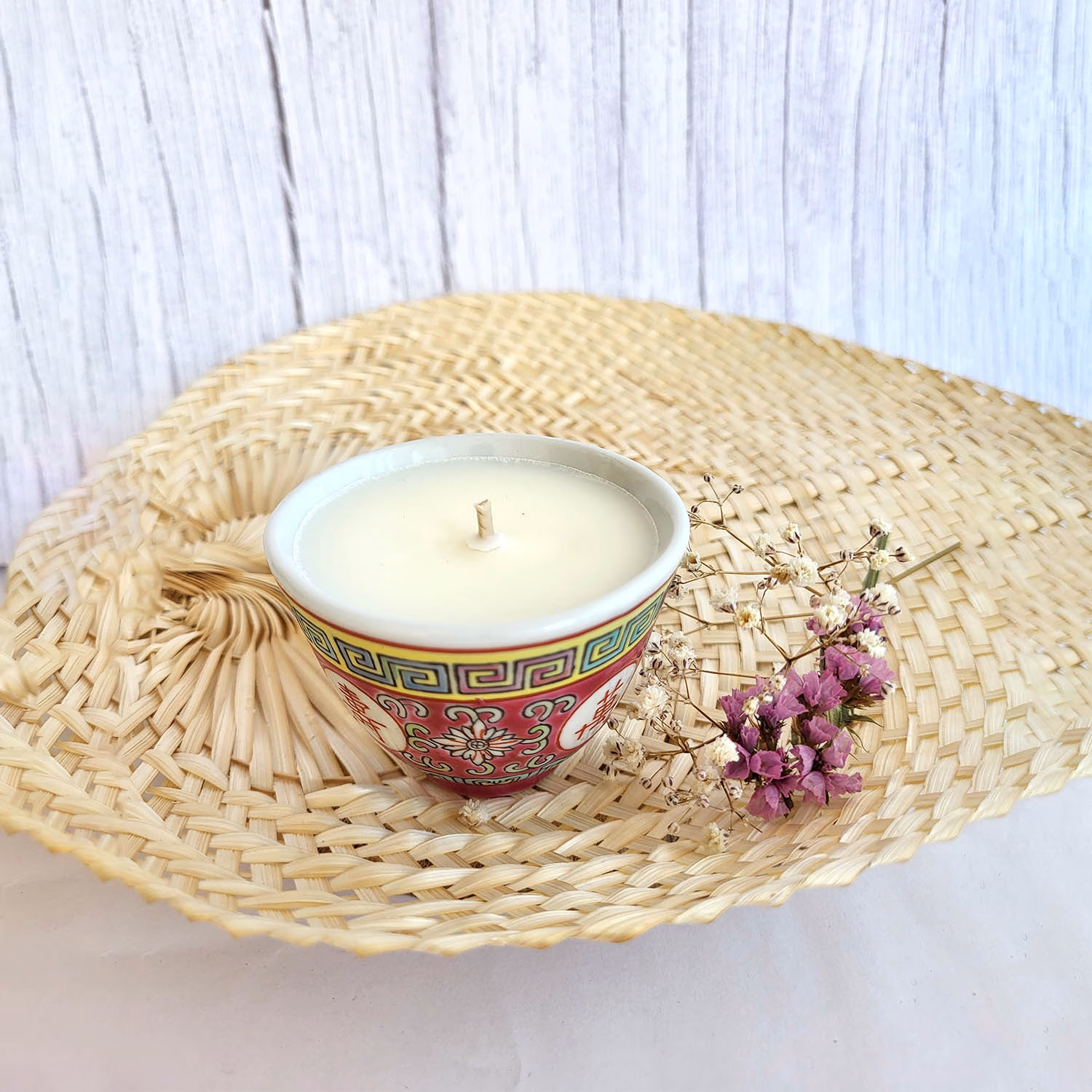 Enso – Lumânare parfumată din ceară de soia 100%, turnată manual în recipient vintage recuperat din târguri de vechituri.