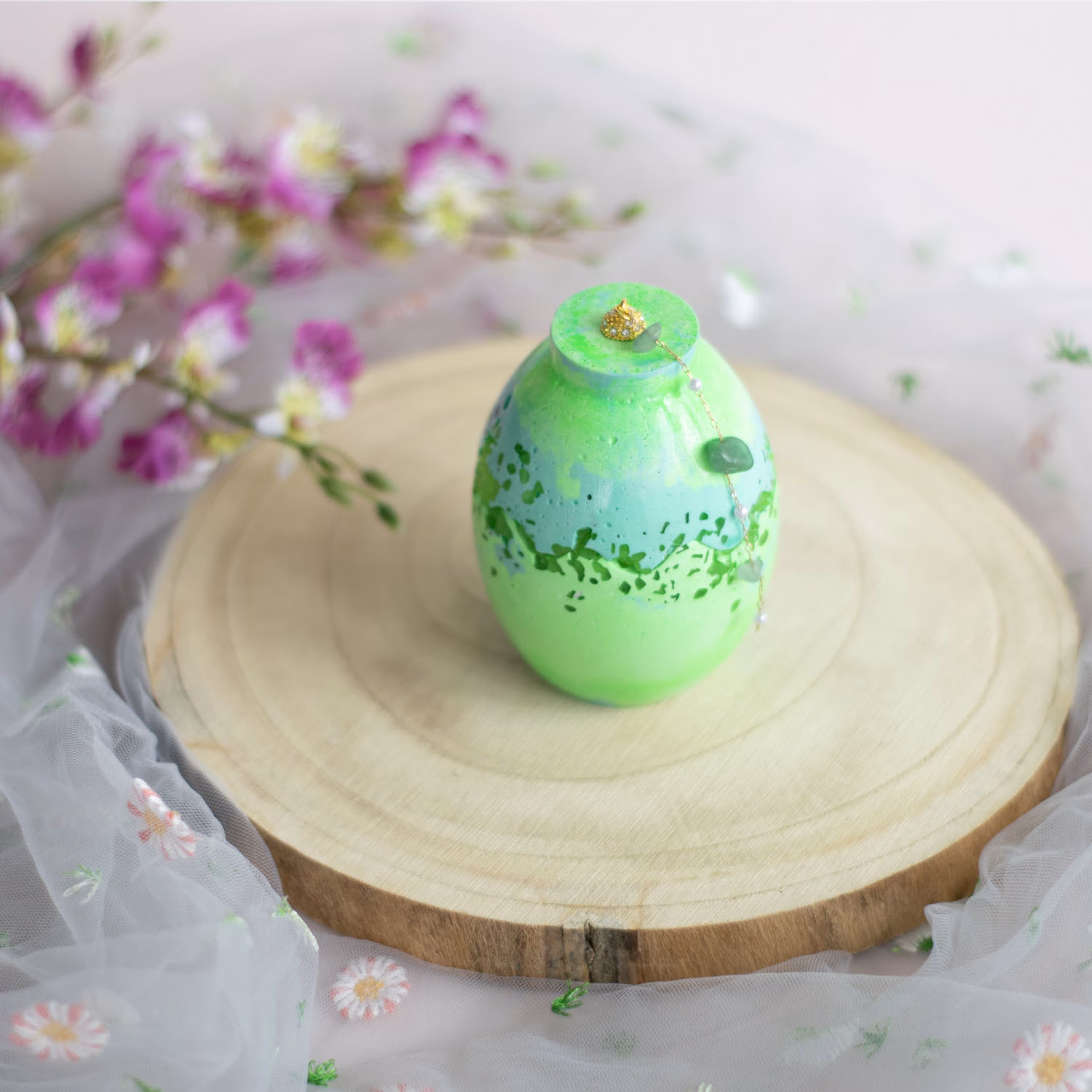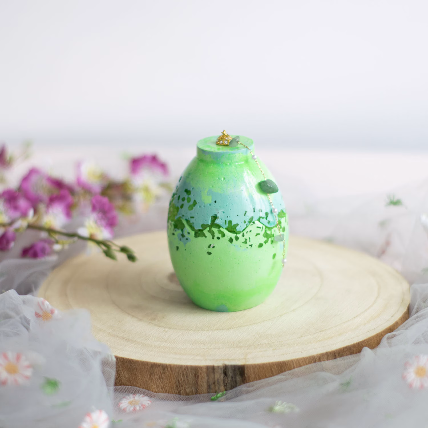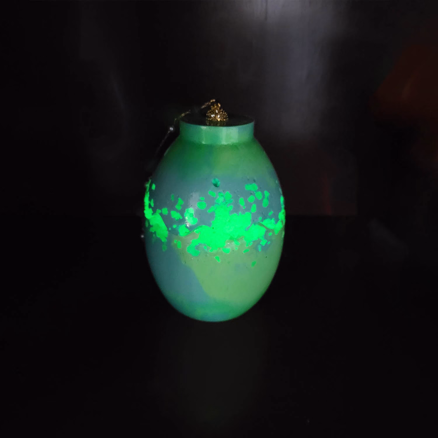 Vasul? Un ou verde, dar nu orice ou verde – ci unul presărat cu praf de stele! Când se stinge lumina, pietricelele din el strălucesc misterios, ca și cum Iepurașul ar fi trecut pe aici și ar fi uitat niște magie în urmă.
