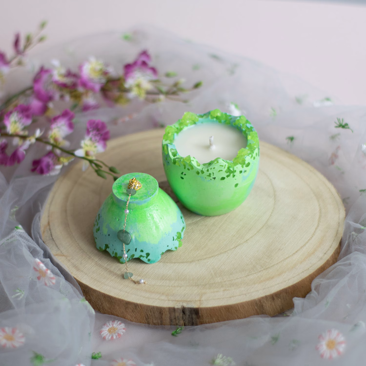 🌼 Inima lumânării: Iasomia delicată adaugă un strop de eleganță, de parcă lumânarea asta a fost la un curs de bune maniere înainte să ajungă la tine.