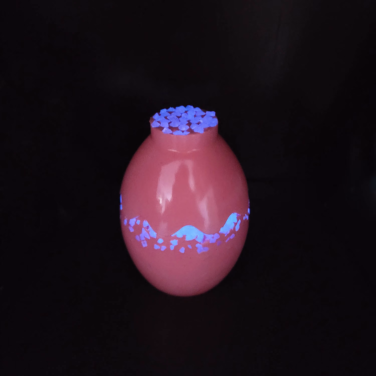 Vasul? Un ou roz, dar nu orice ou roz – ci unul presărat cu praf de stele! Când se stinge lumina, pietricelele din el strălucesc misterios, ca și cum Iepurașul ar fi trecut pe aici și ar fi uitat niște magie în urmă.