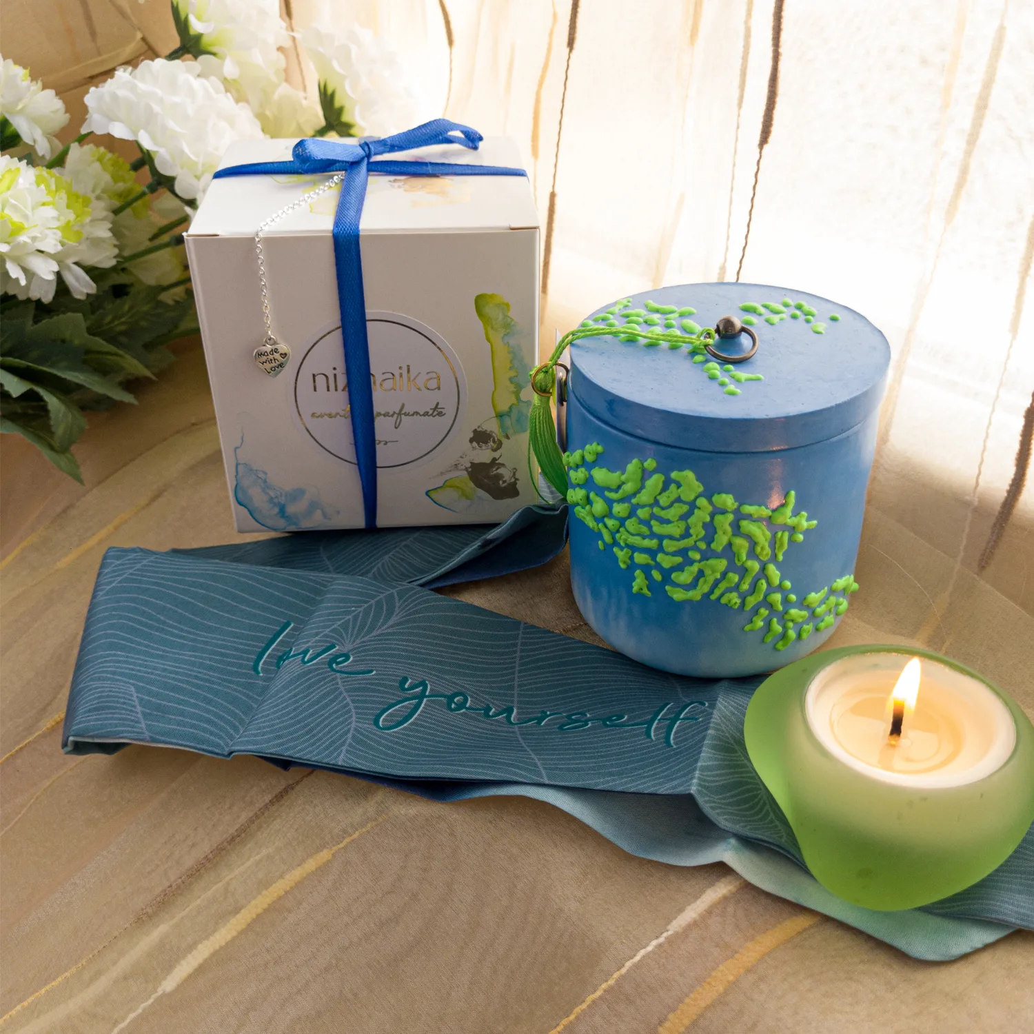 Ca aventura să fie completă, coletul tău conține: lumânarea parfumată în recipient unicat, cutia pictată în acuarelă și accesorizată, eșarfa de mătase asortată (6 cm x 90 cm).