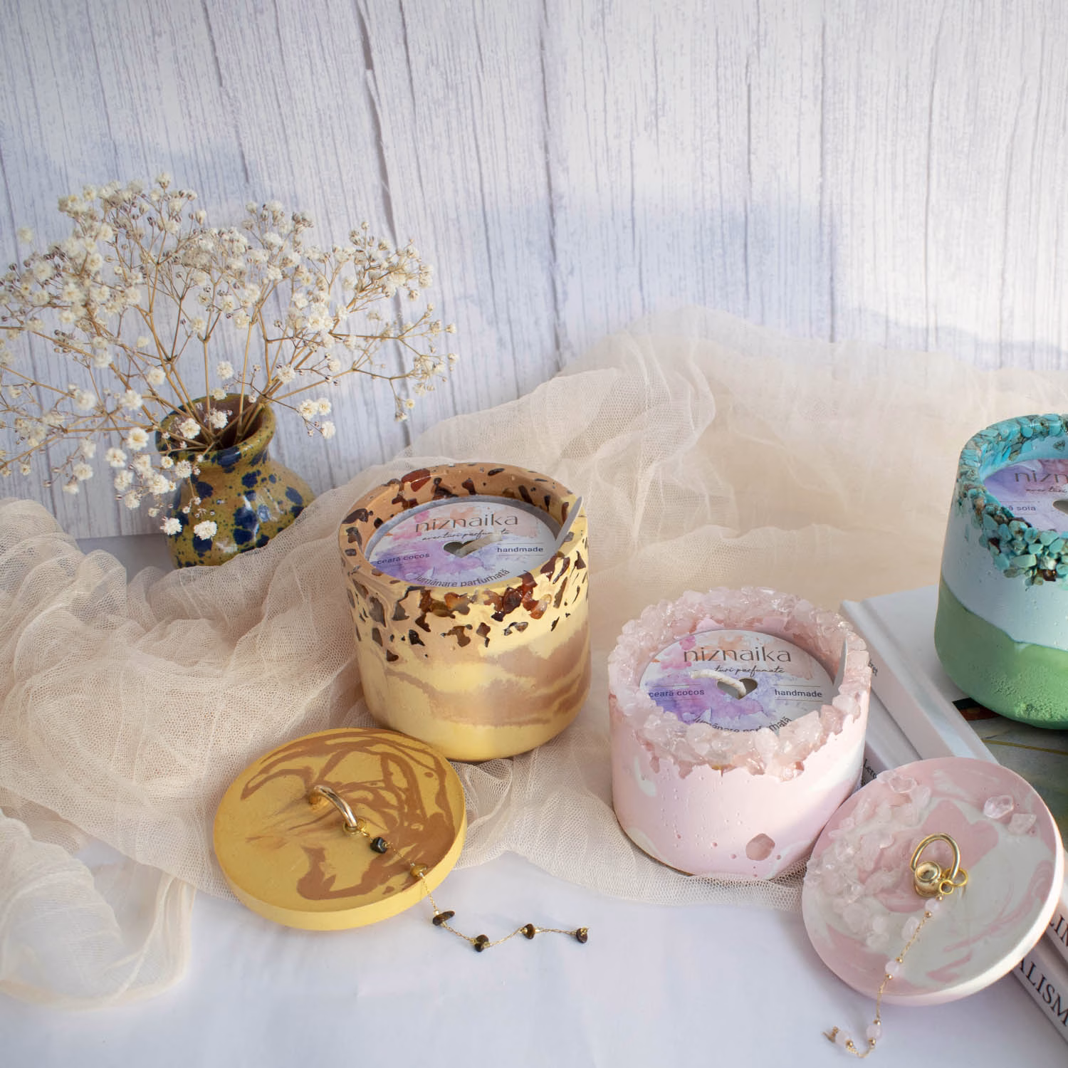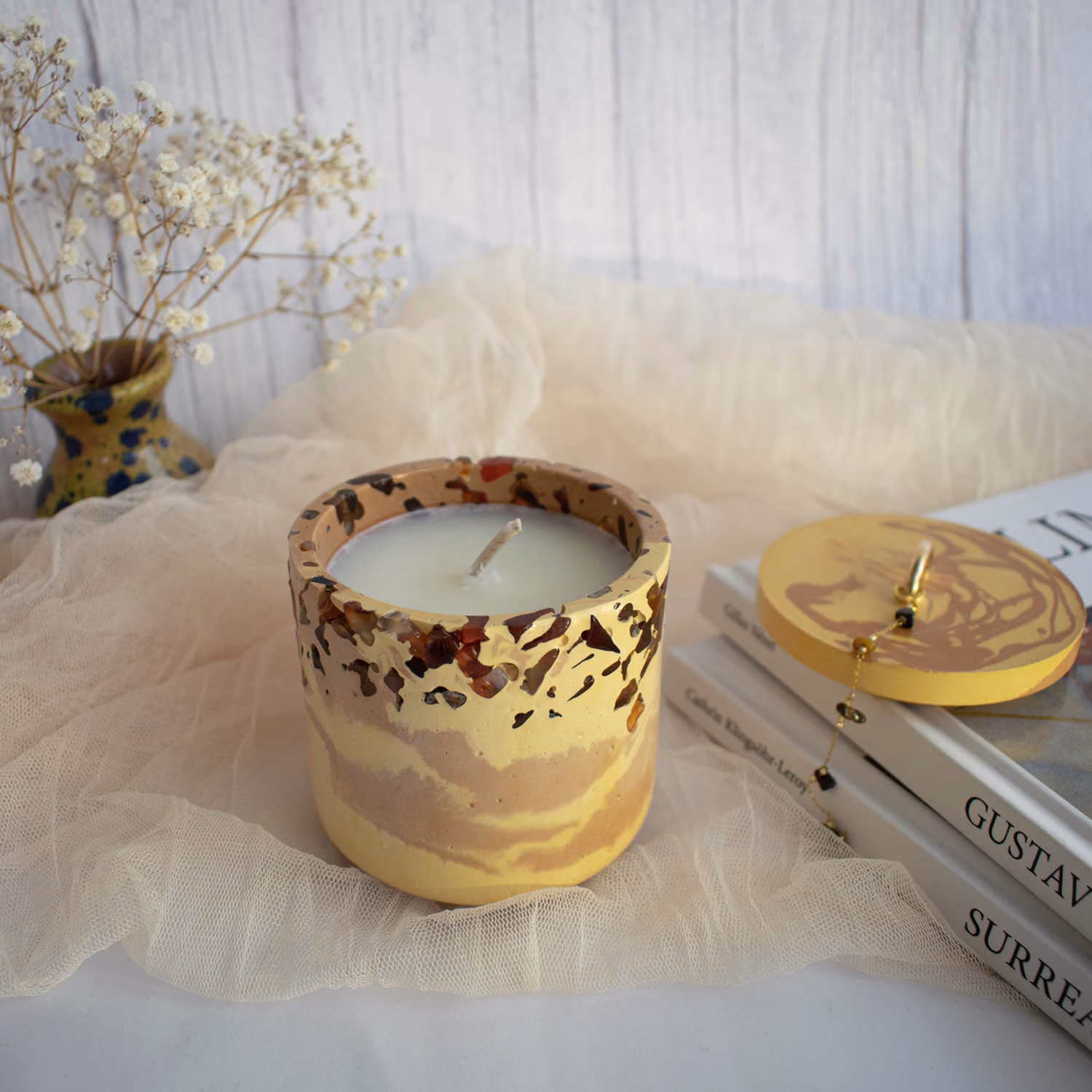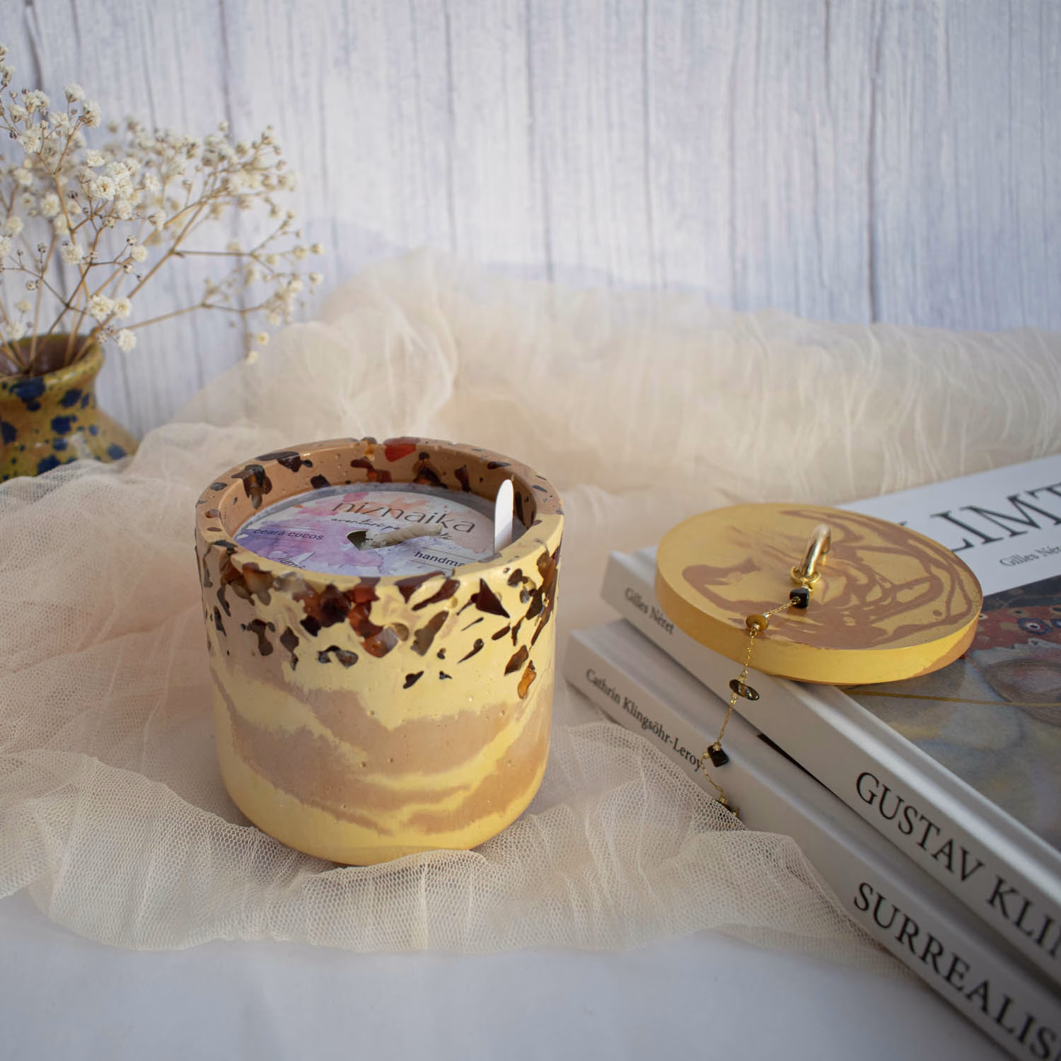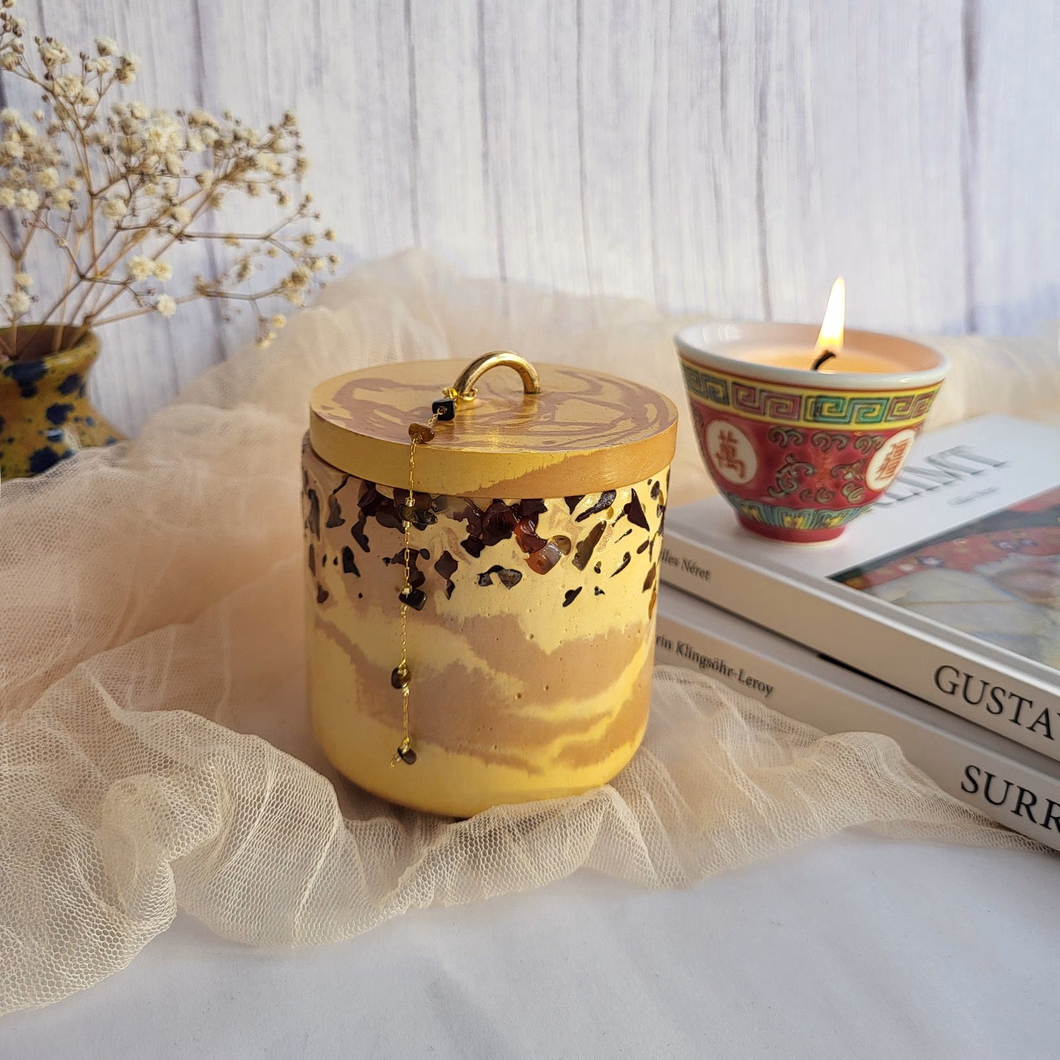 Recipientul este turnat manual și pietre Ochi de Tigru, o piatră semiprețioasă cunoscută pentru proprietățile sale de echilibrare. Se spune că această piatră aduce încredere, curaj și claritate mentală, fiind un talisman împotriva energiilor negative și calmarea oricăror tensiuni. Astfel, lumânarea devine nu doar un obiect decorativ, ci și un aliat al stării tale de bine.