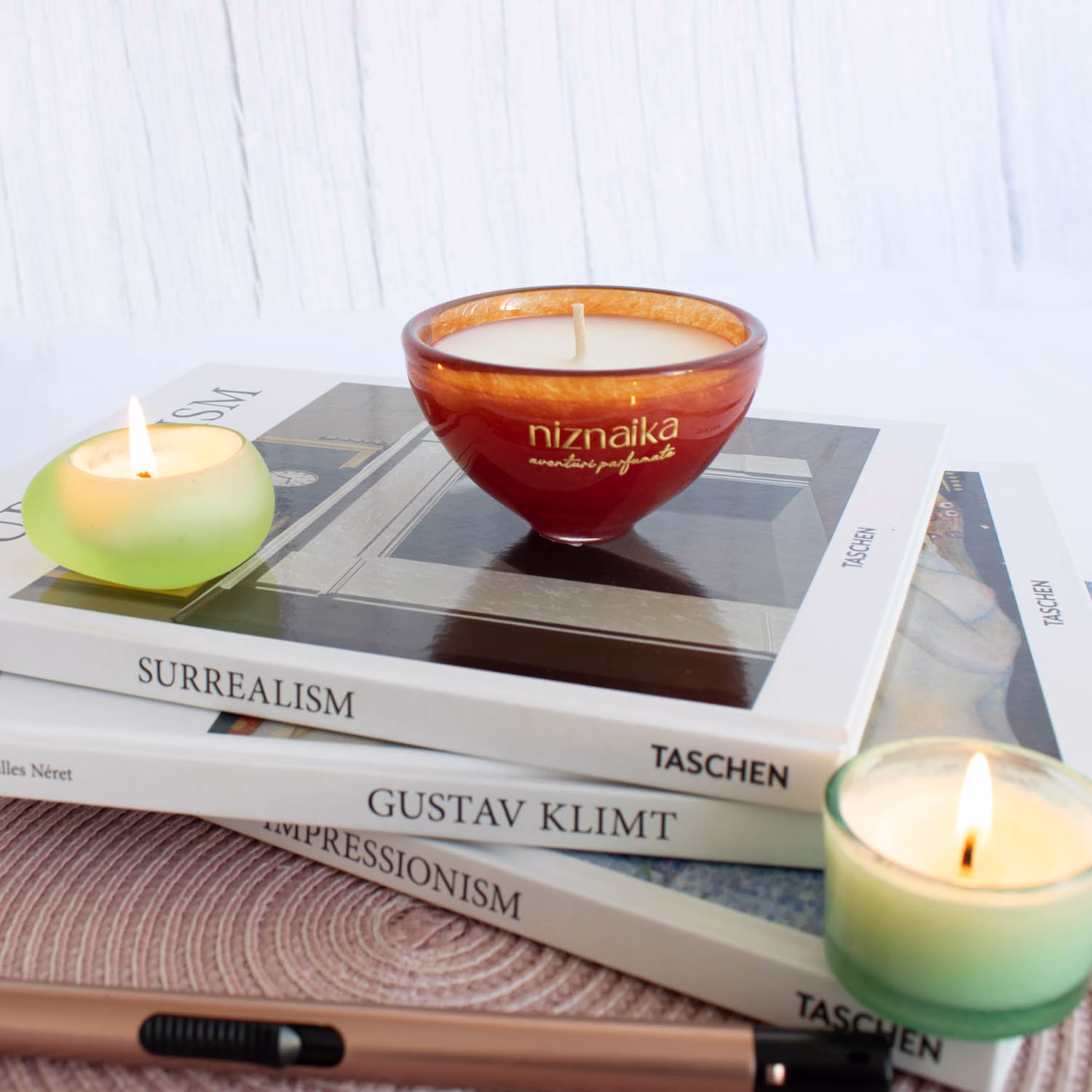 Recipientul său din sticlă groasă este realizat manual într-o fabrică de sticlă din Spania. Lumina caldă a flăcării, reflectată în sticlă, adaugă un plus de farmec și atmosferă intimă.