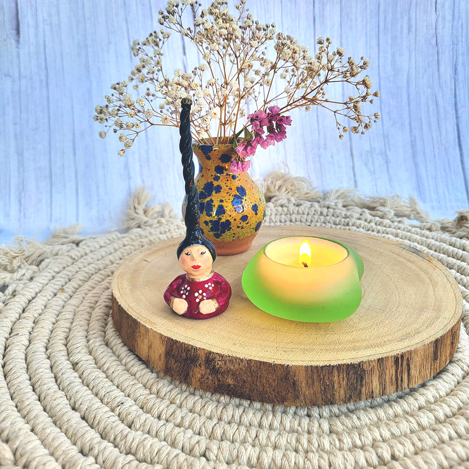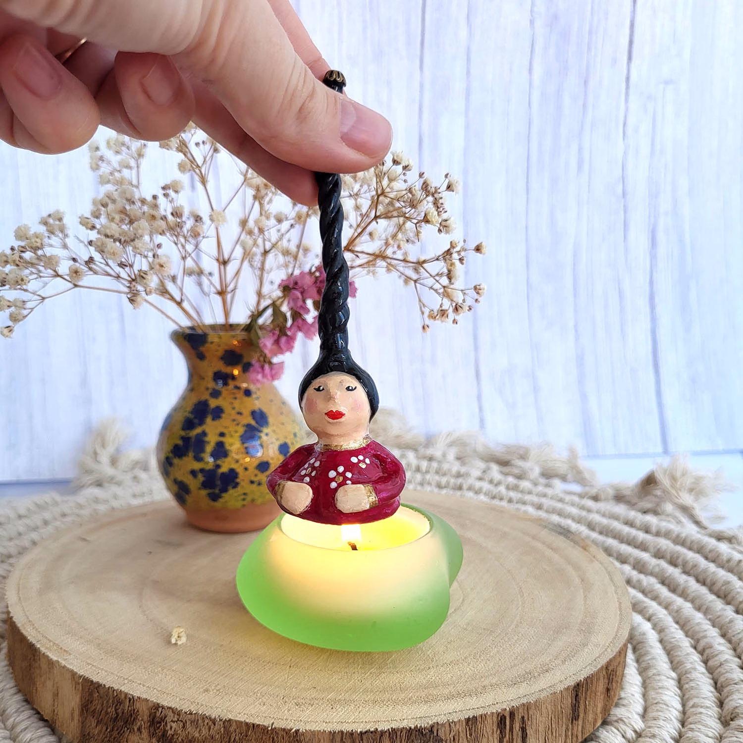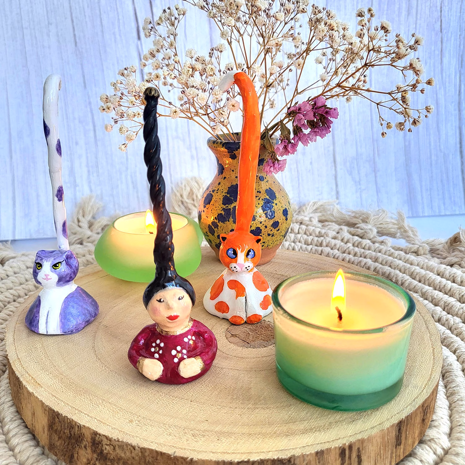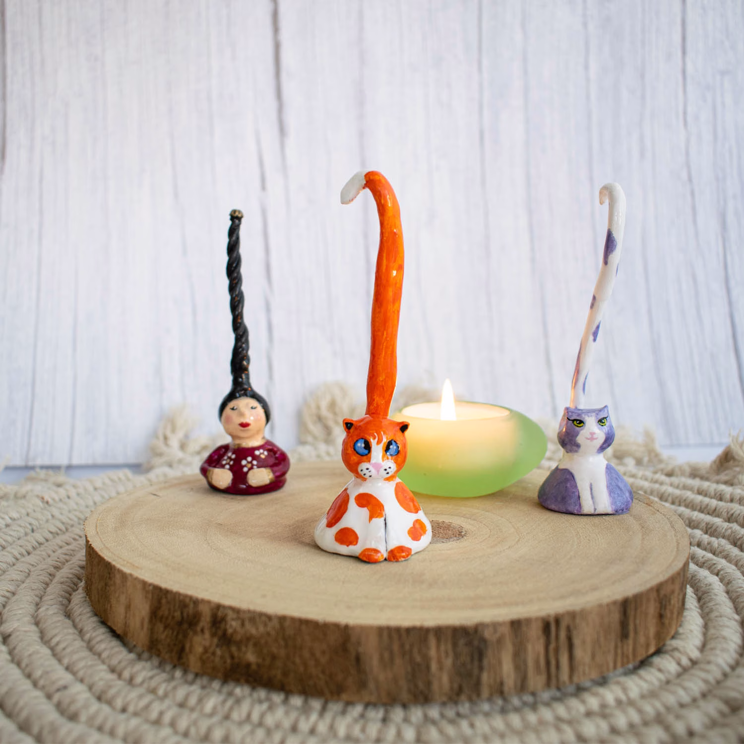 Descoperă mucarnițele – mici clopote realizate manual din lut cu uscare la rece, pictate cu grijă și sigilate cu rășină pentru rezistență și frumusețe de durată. Fiecare mucarniță are o formă unică și poate deveni un personaj care te însoțește în călătoria parfumată începută atunci când aprinzi o lumânare Niznaika.